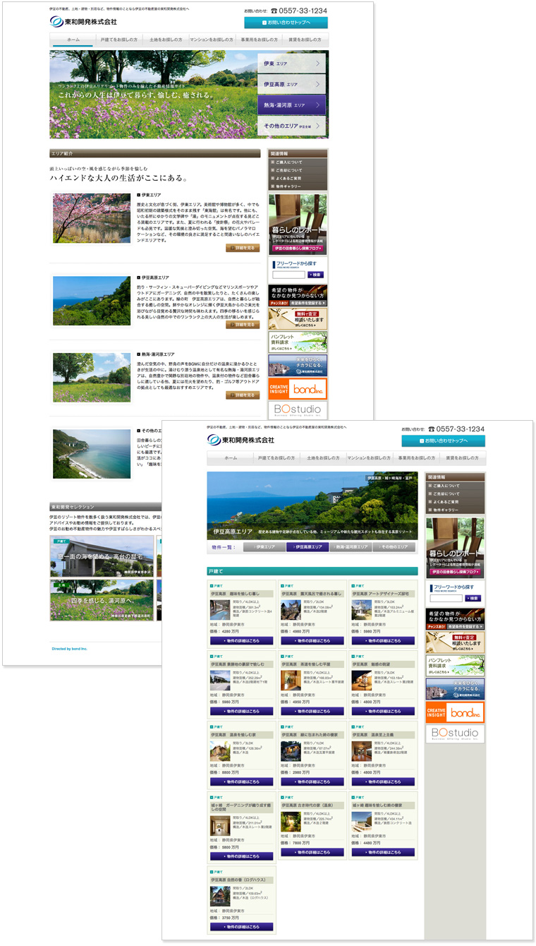 「シンプル」&「高級感」をコンセプトにしたページデザイン。トップページのプロモーションスペースにJavascriptを使用することで、i Phone・i Padなどの端末での閲覧も可能にしました。また、特選物件などをFlashで紹介することで、ユーザーに新しい生活を連想させます。